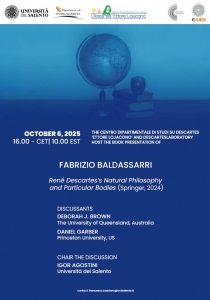 An online event will take place on October 6, 2025, at 4:00 PM (CET) / 10:00 AM (EST) to present Fabrizio Baldassarri’s book Descartes’s Natural Philosophy and Particular Bodies, recently published by Springer. The meeting will feature Daniel Garber and Deb Brown as discussants, and will be chaired by Igor Agostini.