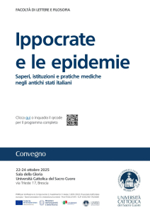 A conclusione del progetto “Institutional controls and health actions to control endemic and epidemic morbidity in Italian states between the 15th century and national Unity” (PRIN 2022 PNRR -M4 C2 Invest. 1.1. – P20222YJFS), dal 22 al 24 ottobre si svolgerà a Brescia, presso l’ Università Cattolica del Sacro Cuore (Sala della Gloria, via Trieste n. 17) il convegno “Ippocrate e le epidemie. Saperi, istituzioni e pratiche mediche negli antichi stati italiani”, organizzato dalla facoltà di Lettere e Filosofia …
